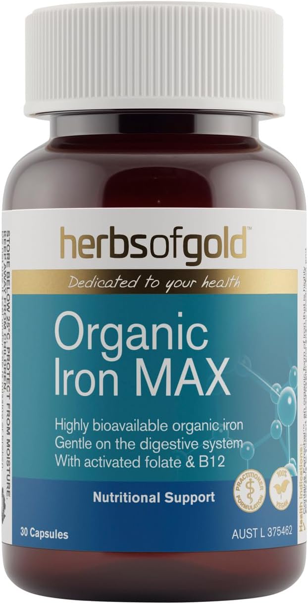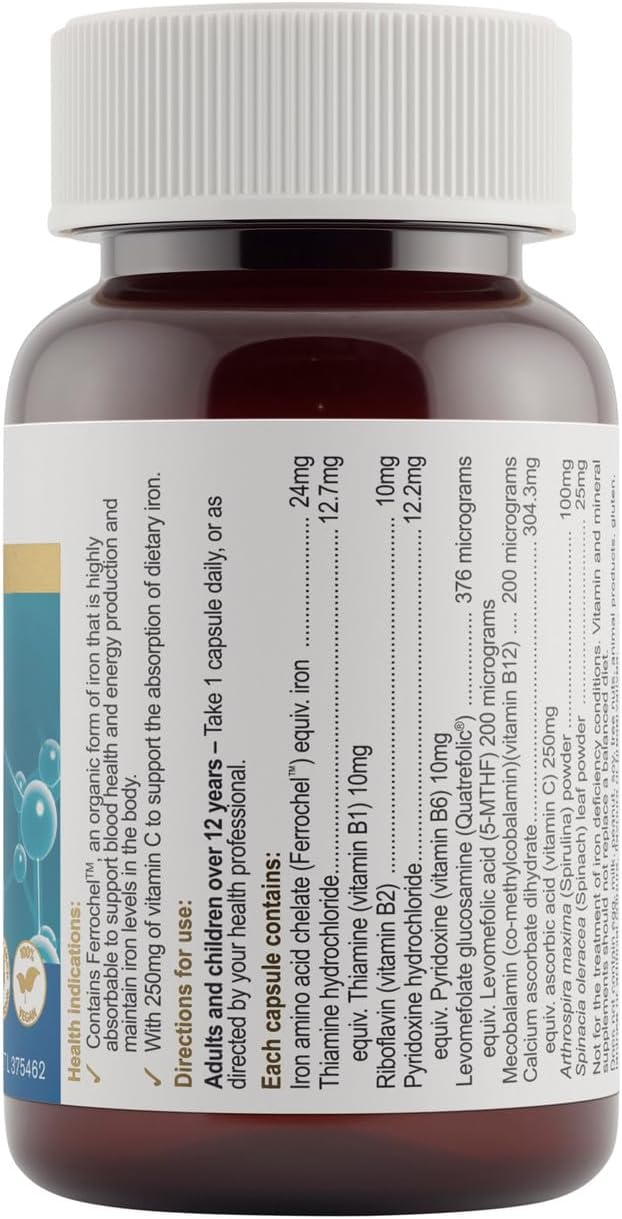 Organic Iron MAX delivers daily iron support through Ferrochel™ (ferrous bisglycinate), a highly absorbable form that minimises digestive discomfort. This comprehensive formula combines iron with folic acid, vitamins B2 and B12 to optimise haemoglobin synthesis and red blood cell development for robust blood health. The inclusion of vitamin C enhances iron bioavailability, whilst spirulina—a nutrient-dense blue-green algae—provides additional iron content. Iron and B12 work synergistically to facilitate oxygen transport throughout the body, supporting cellular energy metabolism and nervous system function, including neurotransmitter synthesis. Vegan-friendly and designed for once-daily convenience, this supplement addresses dietary iron insufficiency with a scientifically-formulated approach.